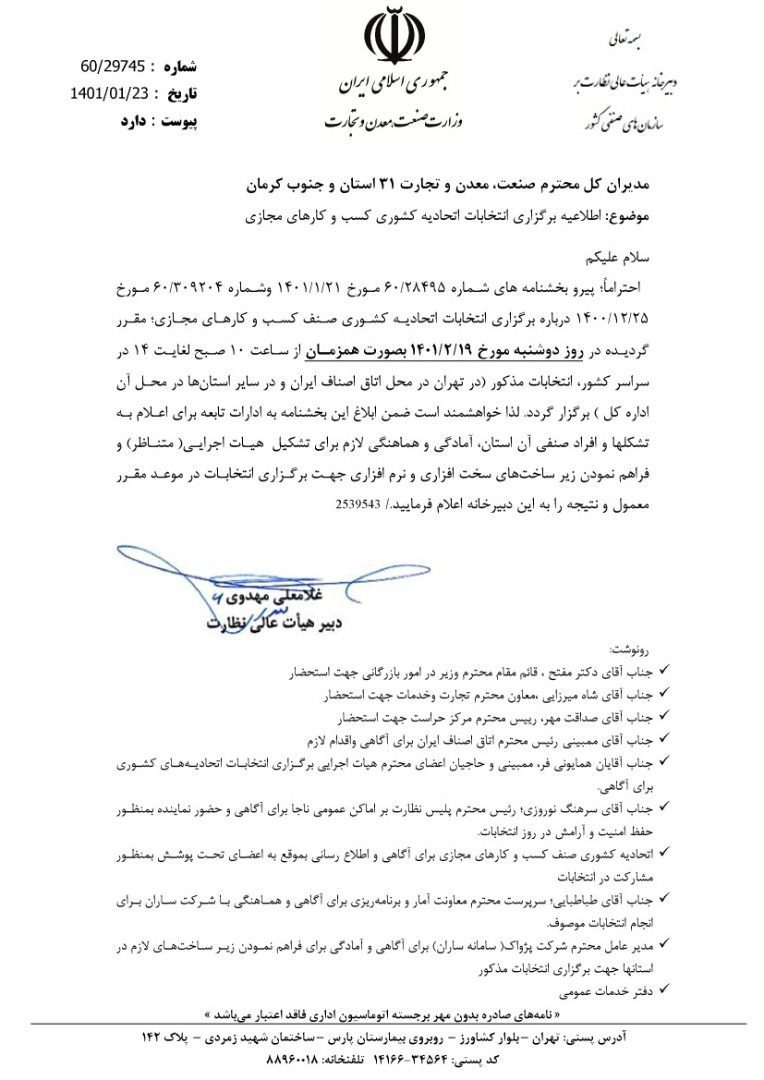 به گزارش استارتاپ360، دبیر هیات عالی نظارت بر سازمان‌های صنفی کشور با ارسال نامه‌ای به مدیران کل سازمان‌های صمت سراسر کشور تاریخ جدید برگزاری انتخابات پر حاشیه هیات‌مدیره اتحادیه کسب‌وکارهای مجازی را تاریخ 19 اردیبهشت 1401 ابلاغ کرد.