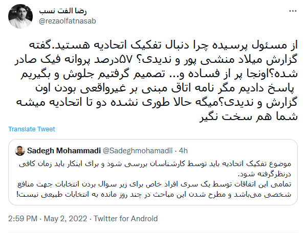 با این حال حواشی انتخابات اتحادیه تا لحظه نگارش این مطلب فروکش نکرده است. رضا الفت نسب در توییتی که به تازگی در حساب خود منتشر کرده به گزارش مدیرعامل تپسی اشاره میکند که بر مبنای آن دستور تفکیک اتحادیه توسط وزیر صمت صادر شده است.