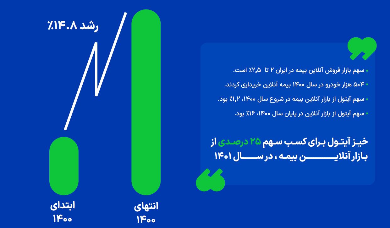 براساس آنچه در گزارش آیتول عنوان شده سهم فروش آنلاین بیمه در ایران 2 تا 2.5 درصد است که این شرکت توانسته تا پایان سال 1400 میزان 16 درصد این سهم را از آن خود کند. همچنین آیتول اعلام کرده برای سال جاری سهم 25 درصدی از این بازار را در نظر گرفته است.