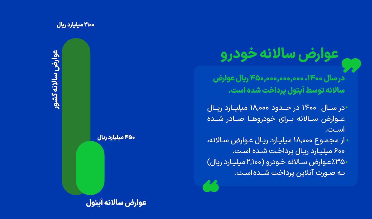 در سال 1400 مبلغ 45 میلیارد تومان عوارض سالانه از طریق آیتول پرداخت شده است. کل مبلغ عوارض سالانه خودروها در کشور 210 میلیارد تومان است که تقریبا یک چهارم آن با آیتول تسویه شده است.