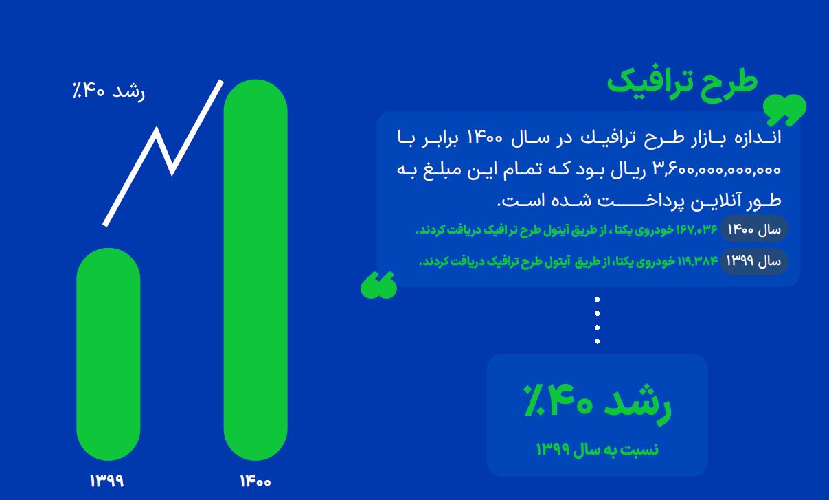 آیتول در گزارش خود اندازه بازار طرح ترافیک را 360 میلیارد تومان اعلام کرده که تمامی آن به صورت آنلاین پرداخت شده است. در این بخش به رقم ریالی طرح ترافیک خریداری از آیتول اشارهای نشده، اما گفته شده بیش از 167 هزار خودرو توسط آیتول طرح ترافیک خریدهاند.
