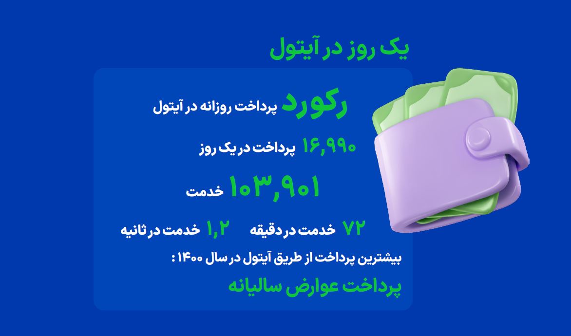 در ادامه گزارش، آمار یک روز در آیتول به شرح زیر بیان شده است. بیشترین پرداخت از طریق آیتول در سال 1400 مربوط به پرداخت عوارض سالانه بوده است.