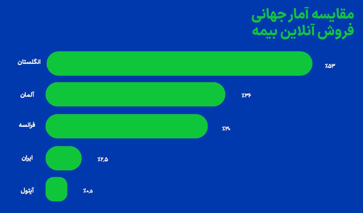 براساس گزارش آیتول بیشترین میزان فروش آنلاین بیمه در دنیای نخست مربوط به کشور انگلیس، و سپس آلمان و فرانسه است. 53 درصد از فروش بیمه در بریتانیا آنلاین انجام میشود. همانطور که پیشتر گفته شد، سهم ایران تنها 2.5 درصد است.
