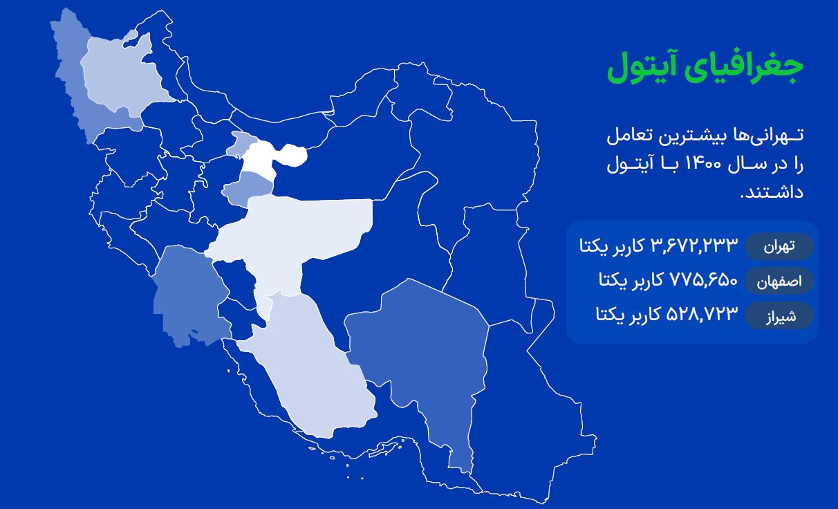 در اسلاید زیر پراکندگی کاربران آیتول به تصویر کشیده شده، که براساس آن تهرانیها و سپس اصفهانیها و شیرازیها بالاترین سهم کاربران را از کل کشور به خود اختصاص دادهاند.