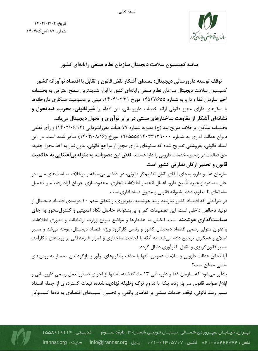 در این بیانیه آمده است که بخشنامه مذکور صراحتاً در تضاد با بند (ج) مصوبه شماره ۷۷ هیأت مقرراتزدایی (مورخ ۱۴۰۲/۰۶/۱۲) و رأی قطعی دیوان عدالت اداری (به شماره ۱۹۶۵۵۵۵۱۴۰۳۳۱۳۹۰۰۰ مورخ ۱۴۰۳/۰۸/۱۶) است. این اسناد قانونی به وضوح تصریح کردهاند که پلتفرمهای دارای مجوز از مراجع قانونی، بدون نیاز به مجوز جدید، حق فعالیت در زنجیره خدمات دارویی را دارند. کمیسیون سلامت دیجیتال نقض این مصوبات را “بیاعتنایی به حاکمیت قانون و تحقیر ارکان نظارتی کشور” تلقی کرده است.