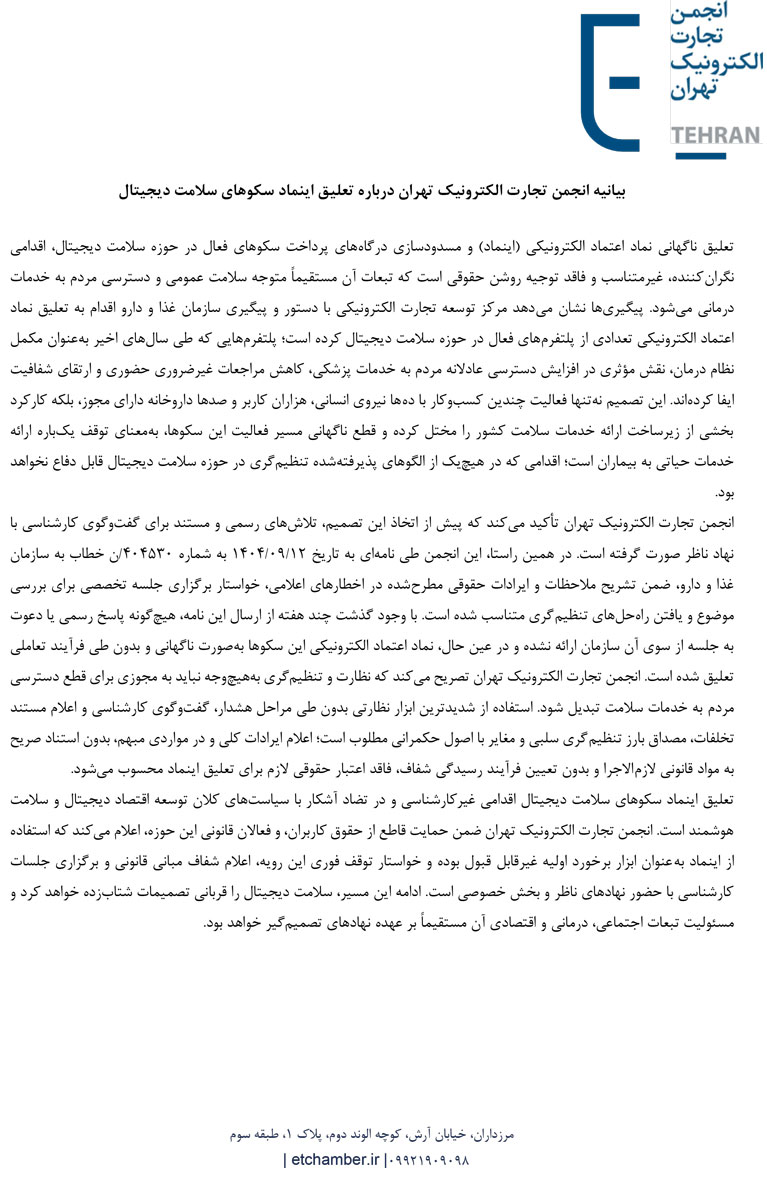 در پایان این بیانیه آمده است: تعلیق اینماد سکوهای سلامت دیجیتال اقدامی غیرکارشناسی و در تضاد آشکار با سیاستهای کلان توسعه اقتصاد دیجیتال و سلامت هوشمند است. انجمن تجارت الکترونیک تهران ضمن حمایت قاطع از حقوق کاربران، و فعالان قانونی این حوزه، اعلام میکند که استفاده از اینماد بهعنوان ابزار برخورد اولیه غیرقابل قبول بوده و خواستار توقف فوری این رویه، اعلام شفاف مبانی قانونی و برگزاری جلسات کارشناسی با حضور نهادهای ناظر و بخش خصوصی است. ادامه این مسیر، سلامت دیجیتال را قربانی تصمیمات شتابزده خواهد کرد و مسئولیت تبعات اجتماعی، درمانی و اقتصادی آن مستقیماً بر عهده نهادهای تصمیمگیر خواهد بود.