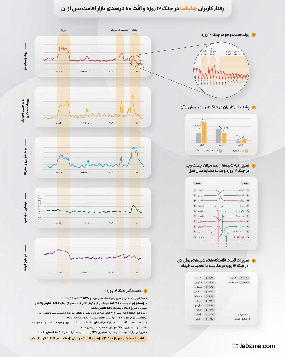 یکی از اولین تاثیرات بحران، افت ۵۰ درصدی جستجو در پلتفرم جاباما بود. با این حال، با اوجگیری تنشها و افزایش موج خروج از تهران، جستجوها با یک جهش ۱۲۵ درصدی مواجه شدند و سپس با شروع اختلال در اینترنت، مجددا ۶۷ درصد کاهش یافتند. بیشترین حجم جستجو برای رزرو اقامتگاه در روزهای ۲۵ تا ۲۸ خرداد به ثبت رسیده است.
