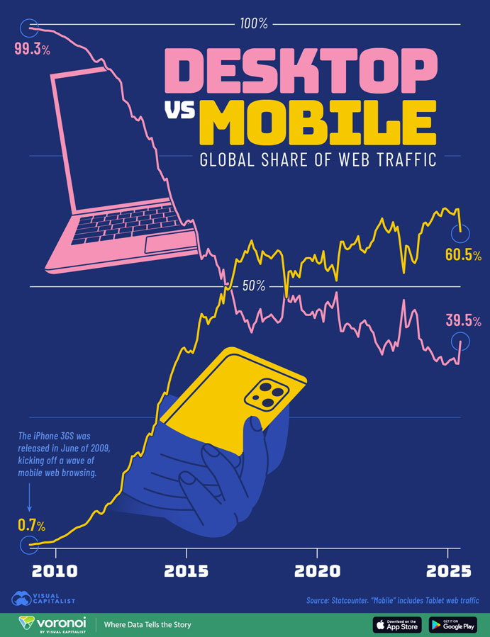 آخرین دادههای منتشرشده از سوی «Statcounter» نشان میدهد که موبایل حالا به بستر اصلی دسترسی به اینترنت در سطح جهان تبدیل شده است. در ژوئیه ۲۰۲۵، سهم موبایل از کل ترافیک وب جهانی به ۶۰.۵ درصد رسید، در حالیکه دسکتاپ تنها ۳۹.۵ درصد را در اختیار داشت. این روند نشاندهنده ادامه سلطه موبایل بر اینترنت در عصر پسااسمارتفون است.