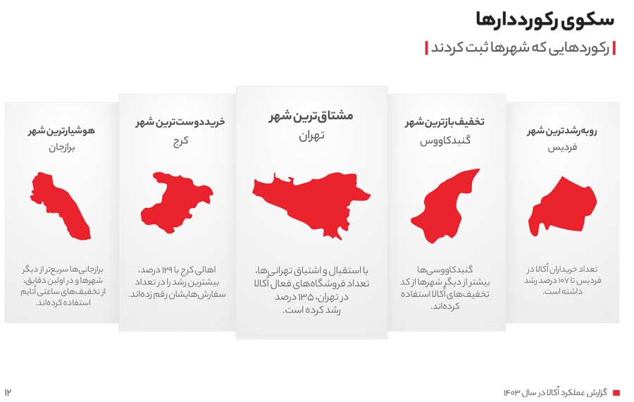 در کنار رکوردهای فردی، شهرها نیز رقابت نزدیکی با یکدیگر داشتهاند. شهر «فردیس» با ۱۰۷ درصد رشد در تعداد خریداران، عنوان «روبهرشدترین» شهر را از آن خود کرده است. «تهران» با رشد ۱۳۵ درصدی تعداد فروشگاهها، «مشتاقترین» شهر لقب گرفته و اهالی «کرج» بیشترین رشد را در تعداد سفارشها رقم زدهاند. در این میان، کاربران «گنبد کاووس» بیشترین استفاده را از کدهای تخفیف داشتهاند و شهروندان «برازجان» سریعتر از دیگران از تخفیفهای ساعتی (اُتایم) استفاده کردهاند.