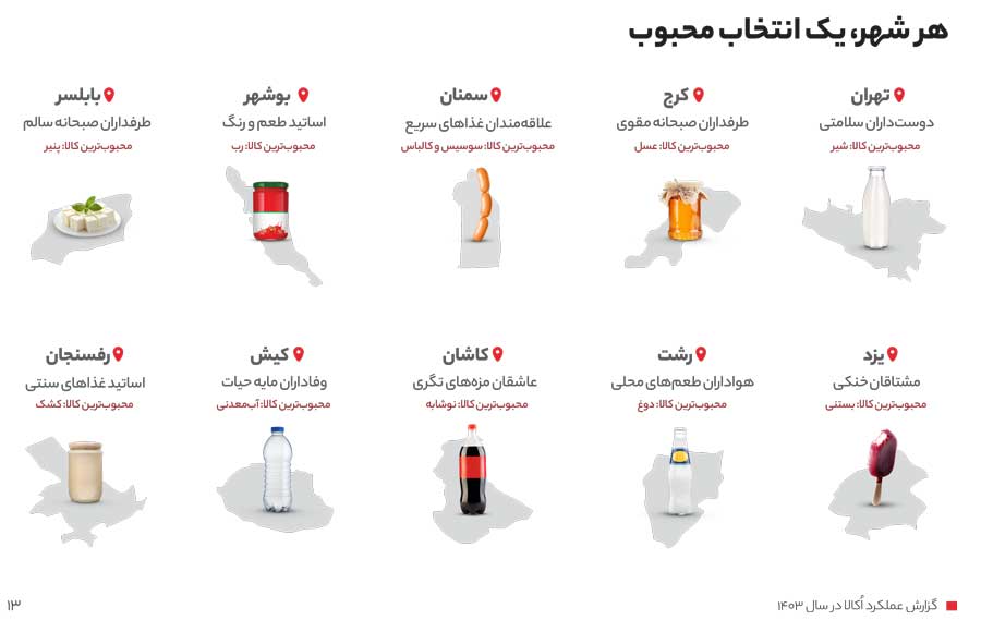 نکته جالب توجه، تفاوت سلیقه و کالاهای محبوب در شهرهای مختلف است. در حالی که تهرانیها بیش از همه «شیر» خریدهاند، انتخاب اول کرجیها «عسل» بوده است. این تنوع در سایر شهرها نیز دیده میشود؛ «بستنی» در یزد، «نوشابه» در کاشان، «پنیر» در بابلسر، «رب» در بوشهر و «کشک» در رفسنجان محبوبترین کالاها بودهاند. این آمار تصویری دقیق از ذائقههای متفاوت در جغرافیای ایران ارایه میدهد.