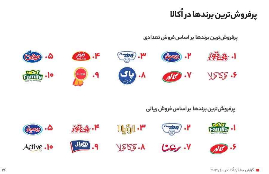 براساس این گزارش، سه کالای پرفروش «اُکالا» از نظر تعداد در سال ۱۴۰۳ به ترتیب «نوشابه کوکاکولا»، «رب گوجه فرنگی رعنا» و «غلات صبحانه چیفلکس چیتوز» بودهاند.