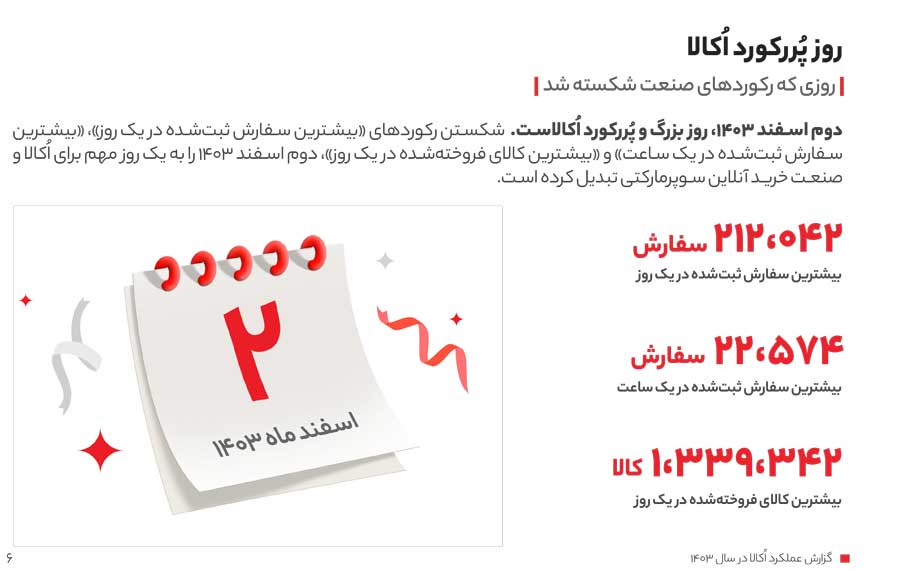یکی از برجستهترین دستاوردهای «اُکالا» در سال گذشته، ثبت رکوردهای جدید در صنعت خرید آنلاین سوپرمارکتی بود. روز دوم اسفند ۱۴۰۳ به عنوان یک روز تاریخی برای این شرکت ثبت شد؛ در این روز، «اُکالا» موفق به ثبت بیش از ۲۱۲ هزار سفارش شد که یک رکورد جدید در این صنعت محسوب میشود.