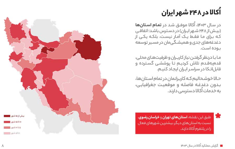 توسعه جغرافیایی یکی از محورهای اصلی فعالیت «اُکالا» در سال ۱۴۰۳ بوده و این پلتفرم اکنون در بیش از ۲۴۸ شهر ایران فعال است. طبق نقشه پراکندگی، استانهای تهران و خراسان رضوی بیشترین تعداد شهرهای فعال را به خود اختصاص دادهاند.