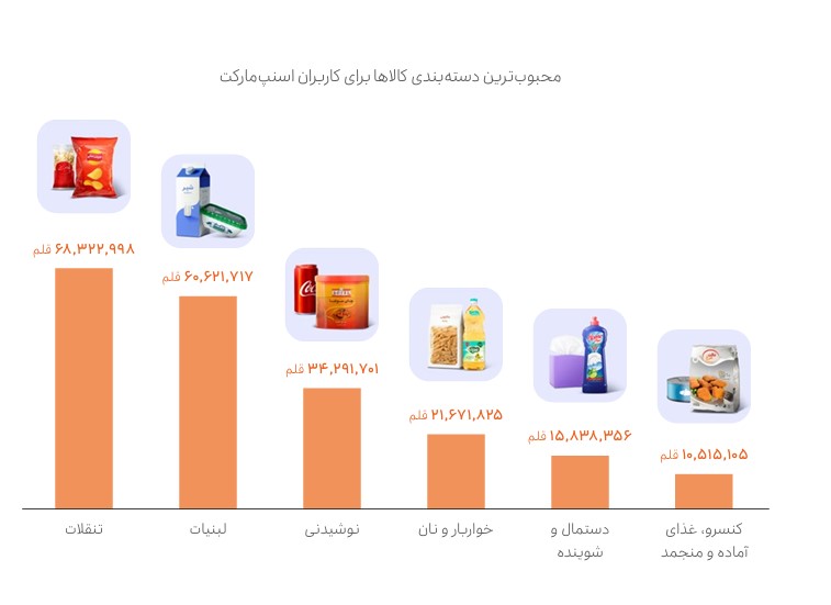 نگاهی به دستهبندیهای پرتقاضا در اسنپمارکت نشان میدهد که پس از تنقلات، لبنیات، نوشیدنیها، خواروبار و نان، کالاهایی هستند که در اولویت سبد خرید کاربران قرار میگیرند.