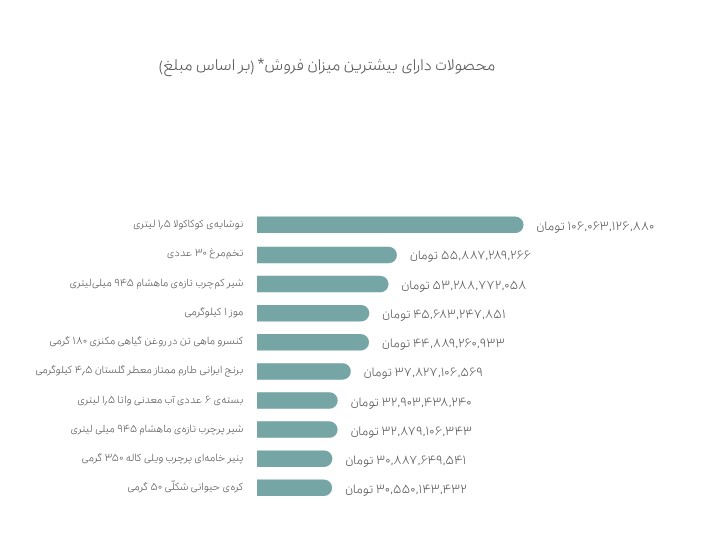 در بین کالاهای پرتقاضا همچنان نوشابه بیشترین سهم را به خود اختصاص میدهد. تخممرغ، شیر، کنسرو ماهی تن، برنج، آب آشامیدنی، پنیر و کره که همگی در دسته کالاهای مصرفی روزمره قرار دارند، پرفروشترین کالاهای سال ۱۴۰۳ در اسنپمارکت بودهاند.