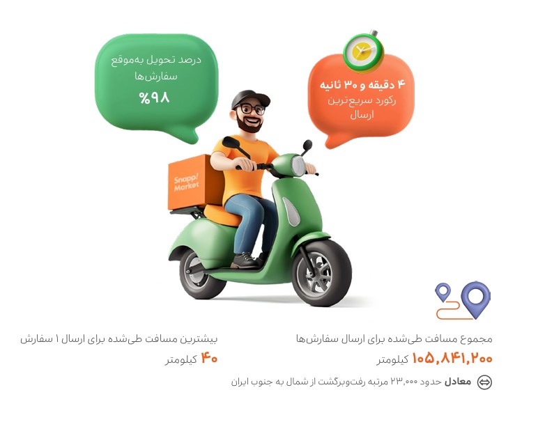 بیشترین مسافتی که ناوگان ارسال اسنپمارکت برای ارسال یک سفارش طی کرده، ۴۰ کیلومتر بوده است.
