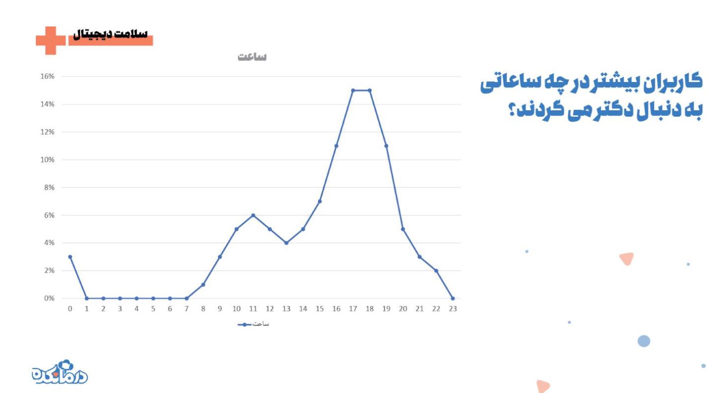 در نیمه دوم این مراسم امیرسینا زمانیان، مدیر بازاریابی درمانکده بیان کرد این استارتاپ از سال ۹۹ به ۱۴۰۰ رقم ۱۳ برابر رشد داشته است. او ادامه داد شنبهها و چهارشنبهها روزهایی است که مردم بیشتر به دنبال وقت گرفتن از پزشک هستند. زمانیان با نمایش اسلاید زیر ساعتهایی که کاربران بیشتر به دنبال خدمات سلامت میگردند را اعلام کرد.