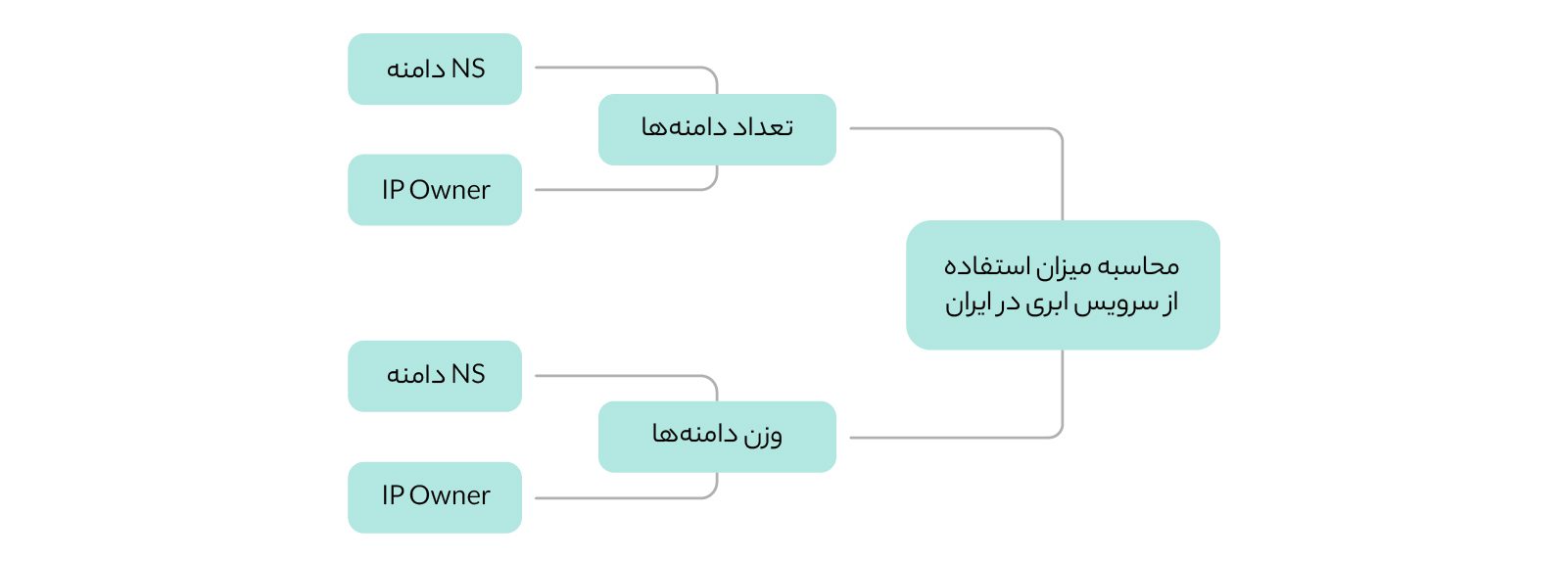 برای تخمین محاسبهی میزان استفاده از خدمات ابری، باید ارایهدهندهی خدمات زیرساخت به دامنهها را شناسایی کرد. برای این کار، میتوان از دو روش استفاده کرد؛ استفاده از IP Owner دامنهها و استفاده از NS دامنهها. باتوجه به تفاوت خروجی این دو روش، تصمیم بر این شد تا میزان استفاده از خدمات ابری در ایران از هر دو روش محاسبه شود.