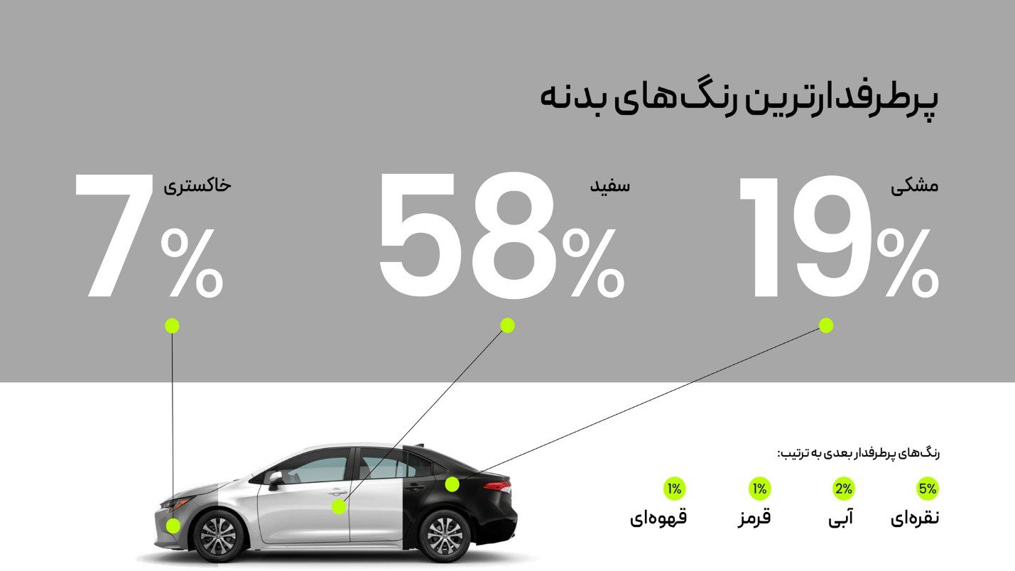رنگهای مورد علاقه مردم برای خودرو را هم در این گزارش میبینیم. در واقع خودروهای آگهی شده منبع این تحلیل بودهاند که براساس آن 58 درصد خودروها سفید، 19 درصد مشکی و 7 درصد خاکستری بودهاند. رنگهای نقرهای، آبی، قهوهای و قرمز هم در ردههای بعدی قرار دارند. اما رنگهای بنفش یاسی، برنزی و پیازی کمیابترین رنگها میان خودروهای آگهی شده هستند.