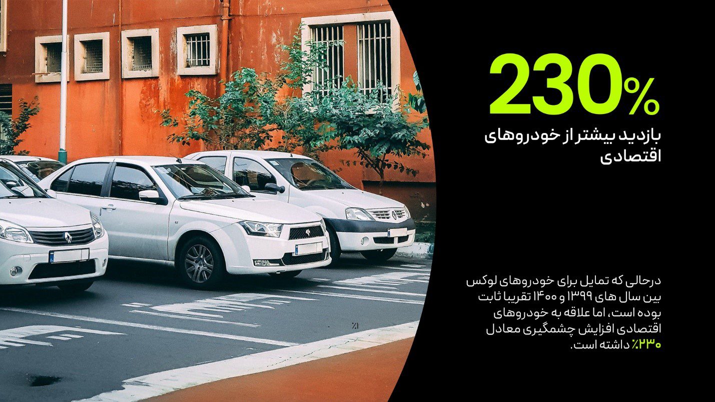 تمایل مردم به انواع خاص خودرو را هم در این گزارش میبینیم. به طور مثال درحالی که تمایل به خودروهای دوگانهسوز 22 درصد کاهش داشته، جستوجو برای خودروهای کممصرف 50 درصد افزایش داشته است. آگهی خودروهای آفرود هم برای بیش از 500 هزار نفر جذاب بوده که این آمار نسبت به سال قبل 27 درصد افزایش داشته است.