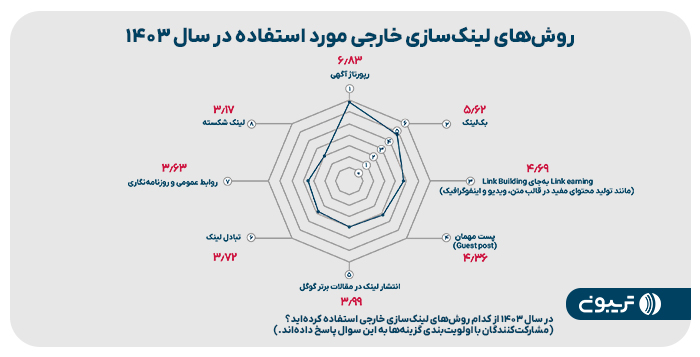 در سال ۱۴۰۳ متخصصان سئو بهترتیب از «رپورتاژ آگهی»، «بک لینک»، «Link earning بهجای Link Building (مانند تولید محتوای مفید در قالب متن، ویدیو و اینفوگرافیک)»، «پست مهمان» و «انتشار لینک در مقالات برتر گوگل»، بیشترین استفاده را برای لینکسازی خارجی انجام دادهاند.