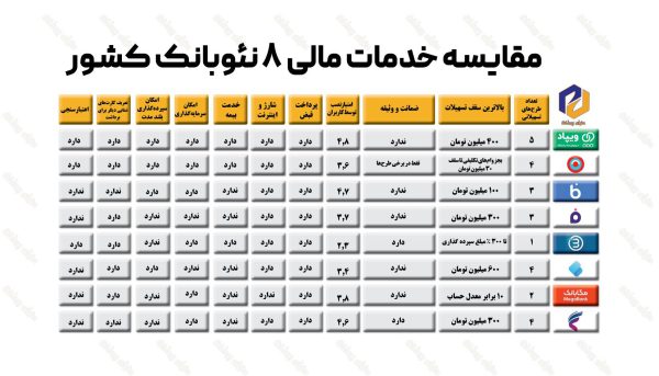 به منظور تسهیل درک تفاوتها و قابلیتهای هر یک از این هشت نئوبانک، خلاصهای از مهمترین خدمات مالی آنها در قالب جدول زیر ارائه شده است: