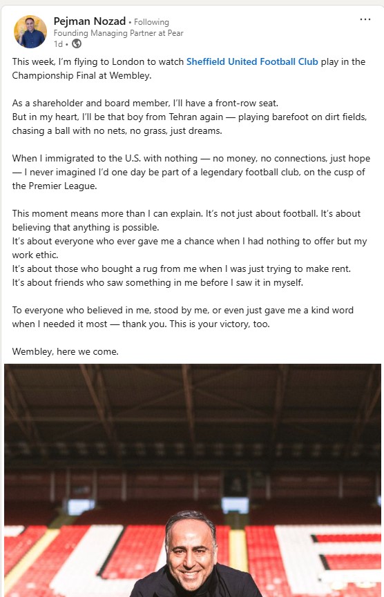 او که قرار است با صندلی ویژه در ورزشگاه ومبلی لندن شاهد تلاش تیمش برای صعود به لیگ برتر باشد، نوشت که هنوز در قلبش همان پسر تهرانی است که پابرهنه در زمینهای خاکی دنبال توپ میدوید: «نه تور بود، نه چمن، فقط رویا.»