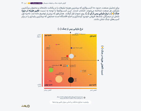 ناحیه چهارم (آسیبپذیرها): در مقابل، صنایعی چون «لوازم خانگی»، «فروشگاههای آنلاین و خردهفروشی»، «تاکسیهای اینترنتی» و «پوشاک» با بیش از ۵۰ درصد کاهش بودجه مواجه شدند و روند بازیابی کندی داشتند. این گروه با ۳۷ درصد، بزرگترین دسته از کسبوکارها را شامل میشوند.